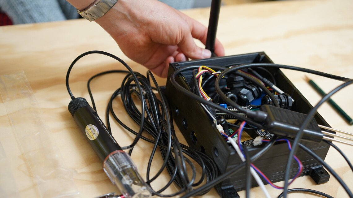 Nun, wo die Wurmkiste funktioniert, soll ein Upgrade her. Um einen Einblick in das Innenleben der Wurmkiste zu bekommen, entwickelt Martin, der als Werkstudent beim CEB arbeitet, gerade eine Sensorik. „Die Sensoren sollen die Temperatur, die Luft, die Bodenfeuchtigkeit und den Bodenleitwert sowie den PH-Wert des Wassers messen“, sagt er. Außerdem soll der TDS-Wert erfasst werden. TDS steht für „Total Dissolved Solids“, was ins Deutsche übersetzt die gesamte Menge an gelösten Feststoffen meint. Anhand dieser Daten können Rückschlüsse über die Qualität des Wassers gezogen werden.