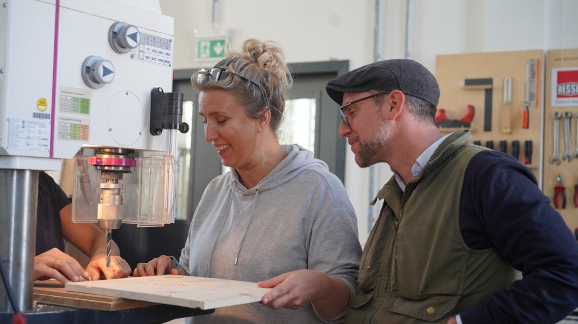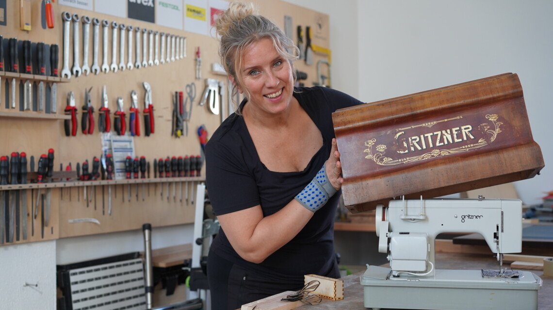 Das vierte Projekt war der Bau eines Unterkastens für Catharinas Nähmaschine, ein Unikat der Firma Gritzner aus den 60er Jahren. „Ich habe zwar eine originale Abdeckung aus Holz, aber ein Untertisch hat mir bisher gefehlt“, sagt sie. Nun kann sie die Nähmaschine noch besser in Szene setzen. Das Nähen ist für Catharina eine Leidenschaft. Sie entwirft gerne Mode und Textilien für den Alltag, zum Beispiel für den Gebrauch in der Küche und im Haushalt. „Ich verwende dabei gerne eine Mischung aus neuwertigen Materialien und Materialien aus bereits vorhandenen Textilobjekten, die ich upcycle.